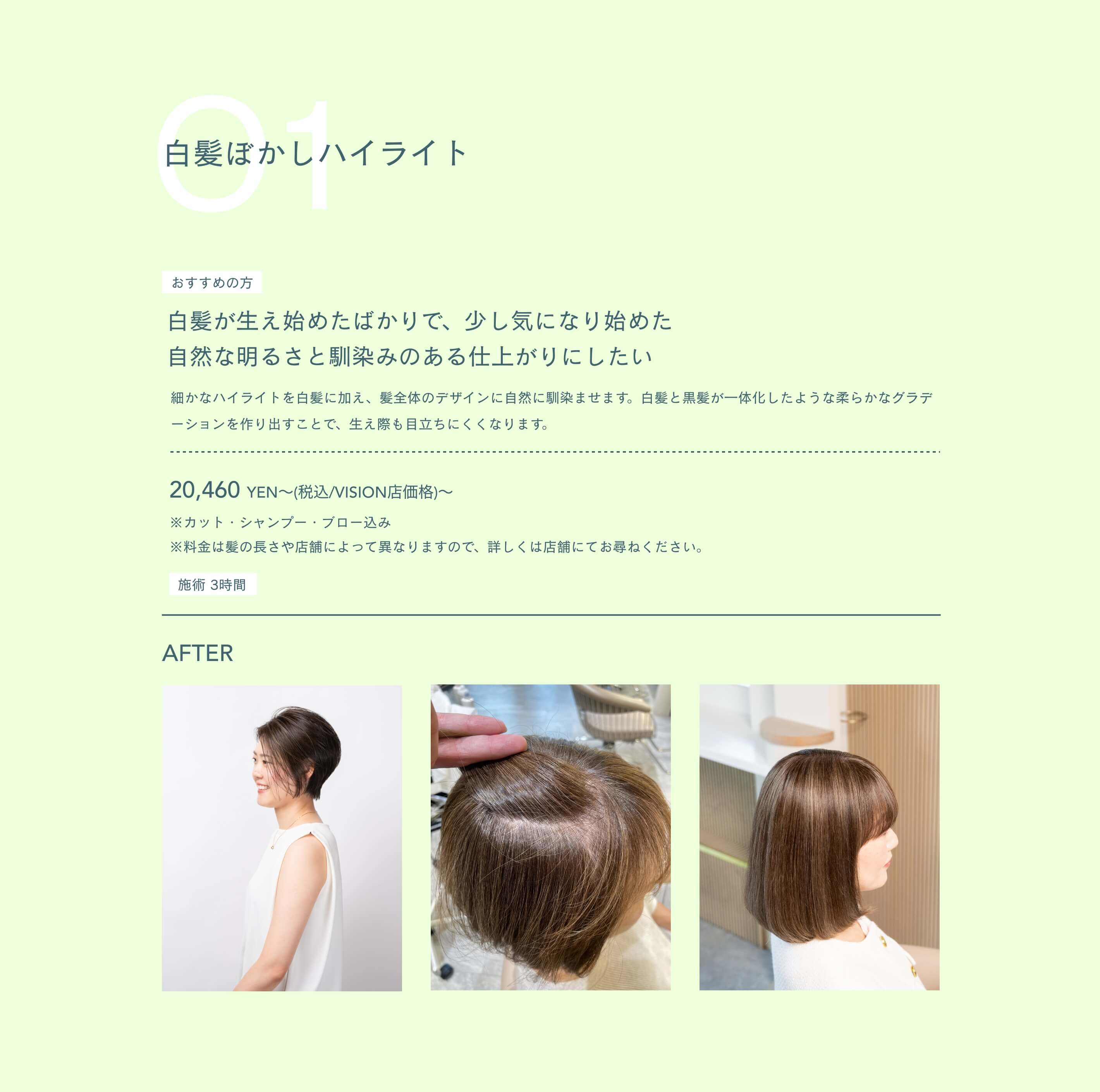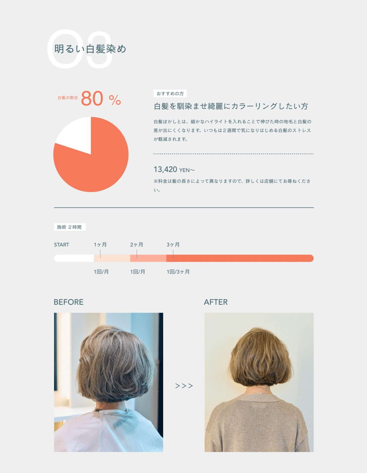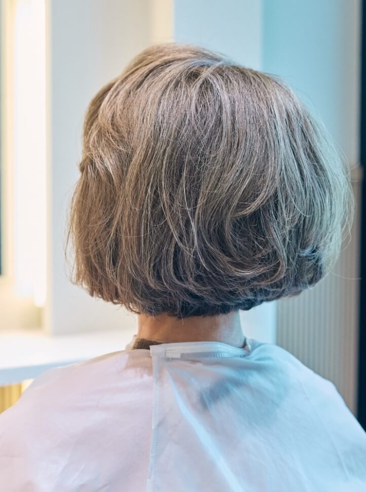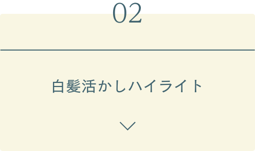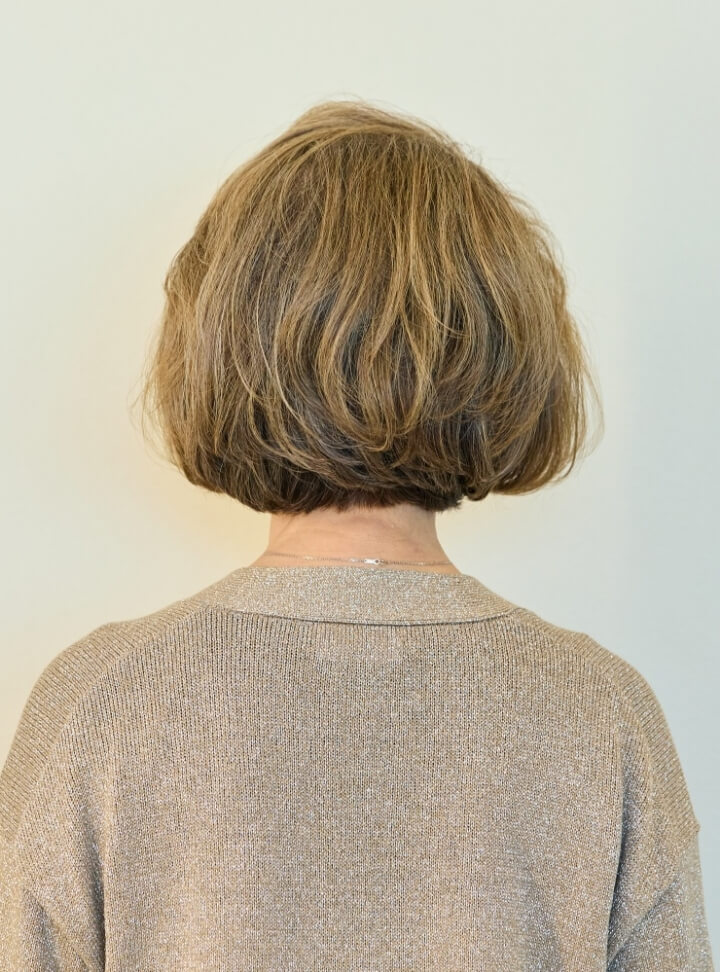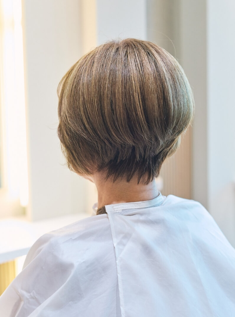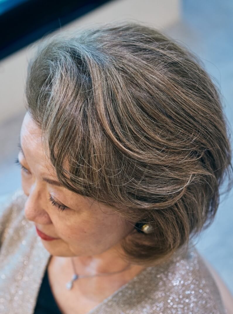 白髪を隠すだけでなく、活かすことで若々しい透明感を演出。ふんわりと立体的に見えるカラー技術で、軽やかな印象を叶えます。
