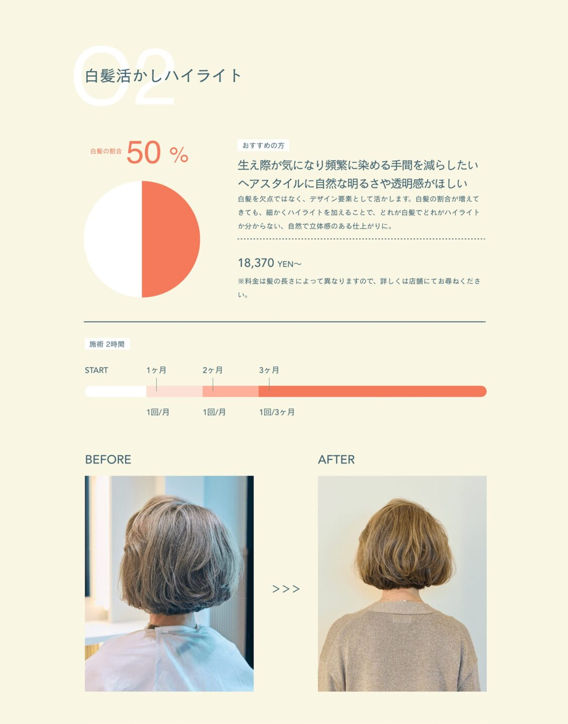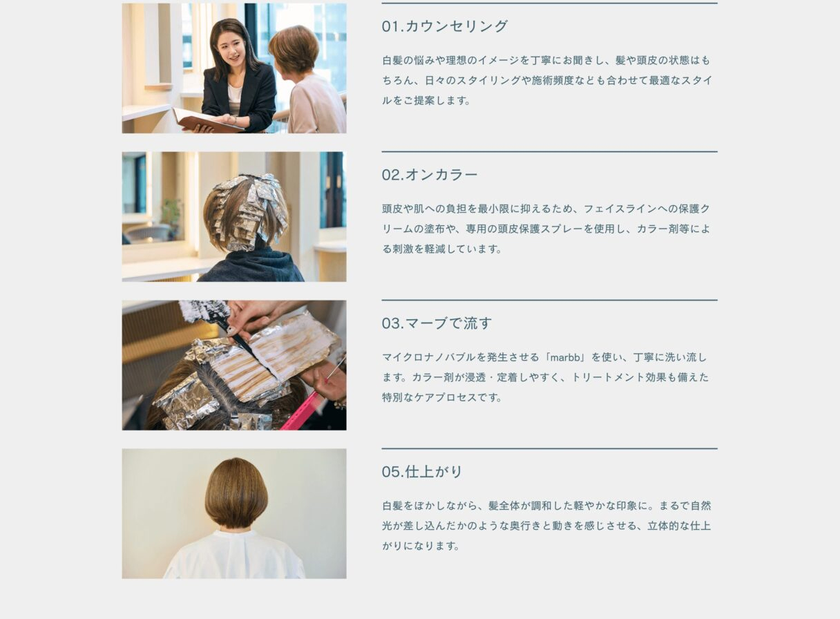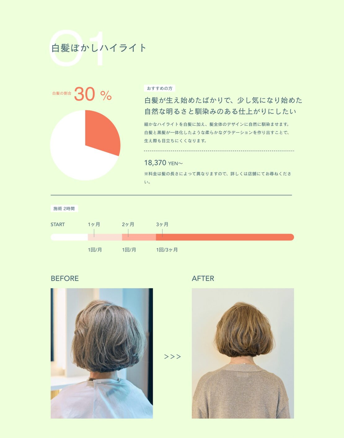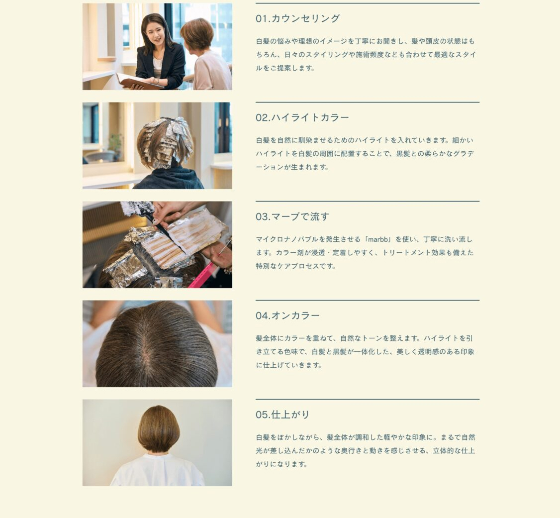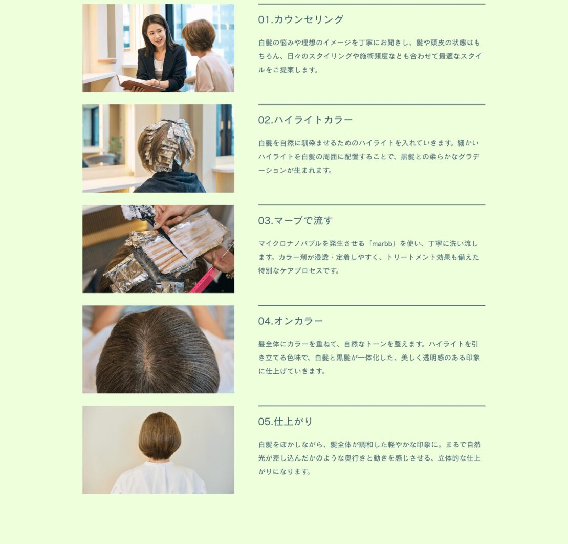 白髪染めを使わずに刺激を抑えたカラーリング方法で、髪質をキープしながら自由にカラーを楽しめます。