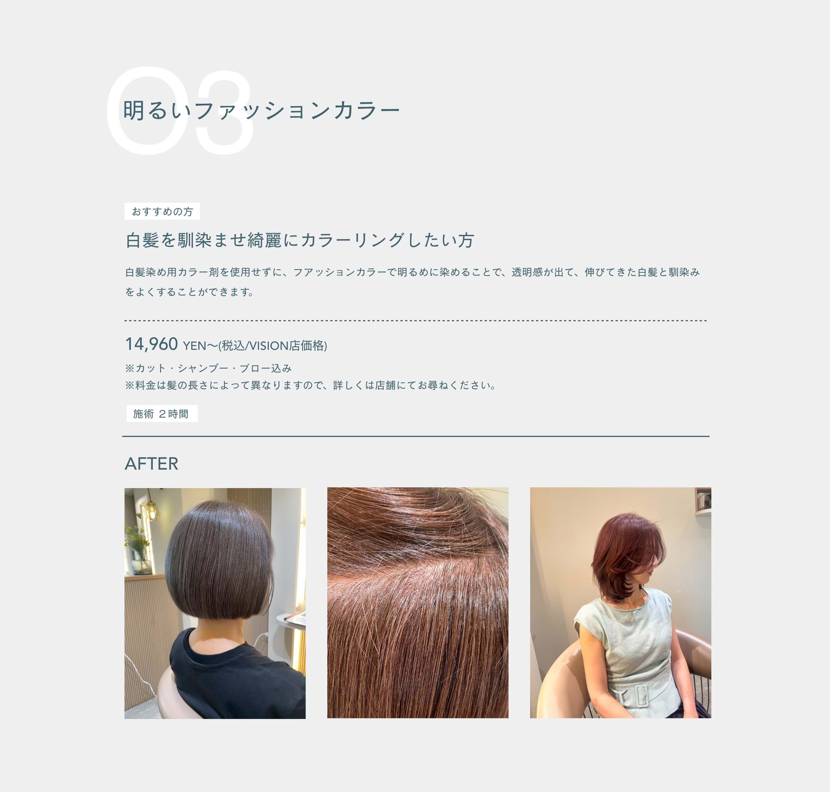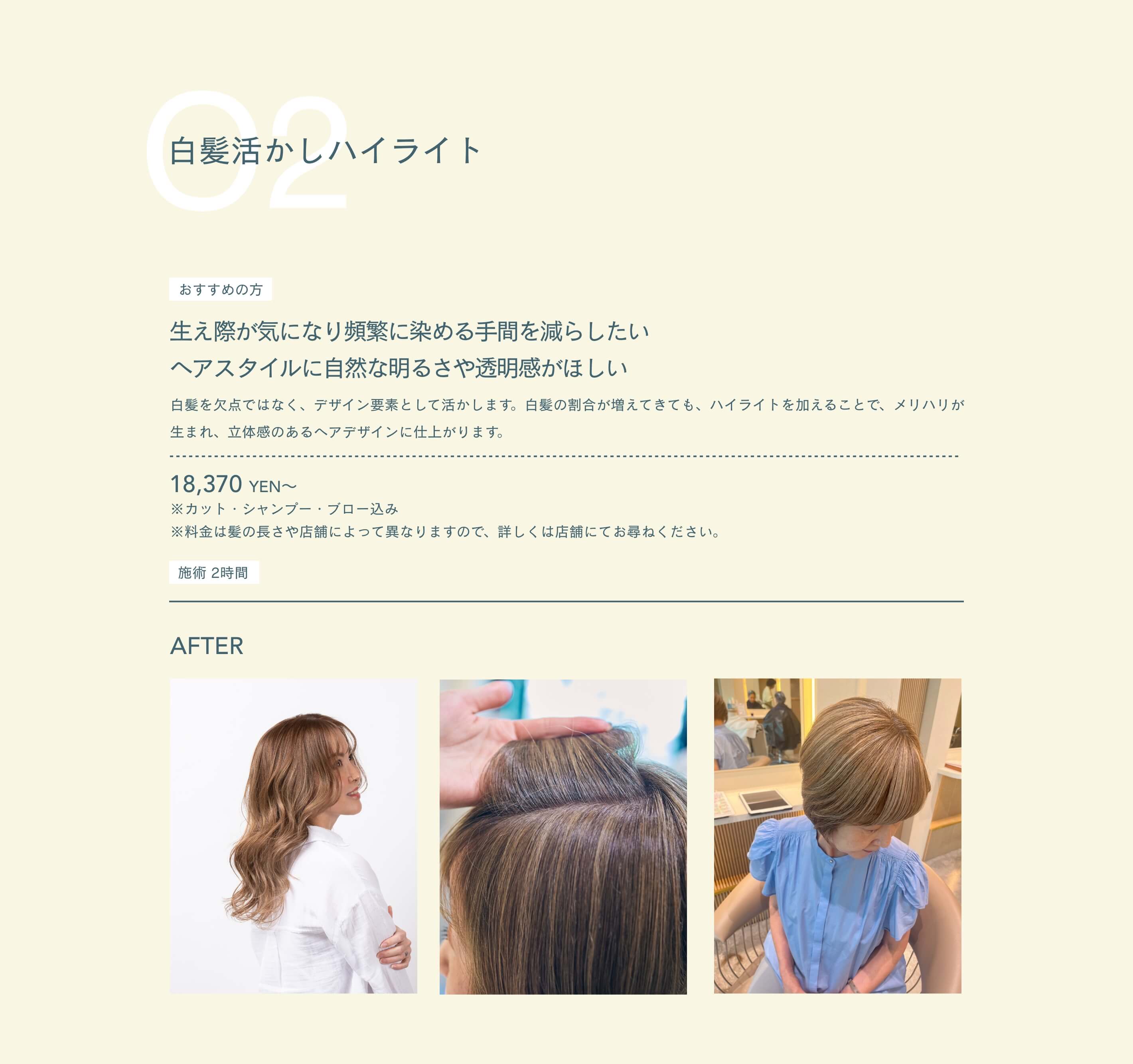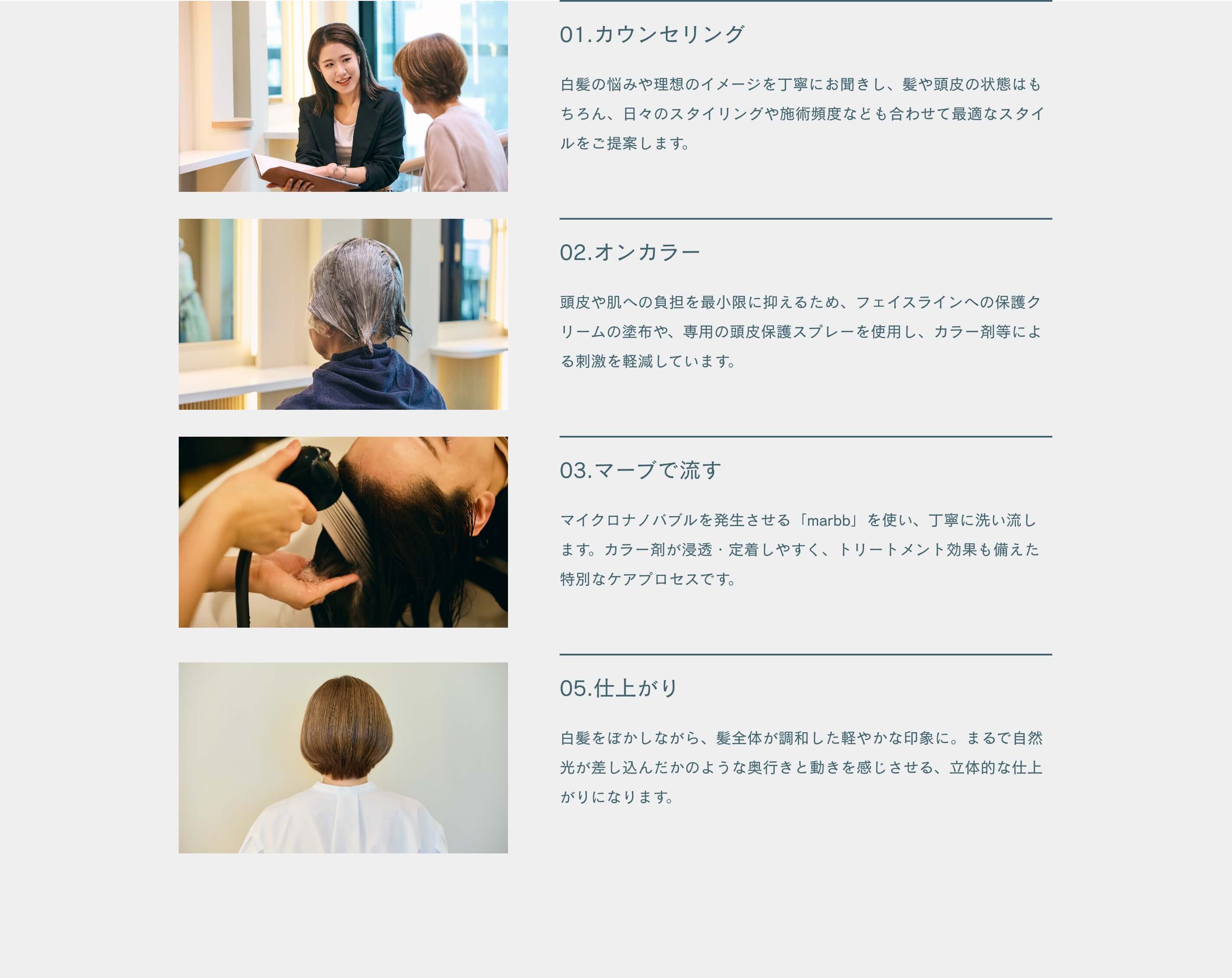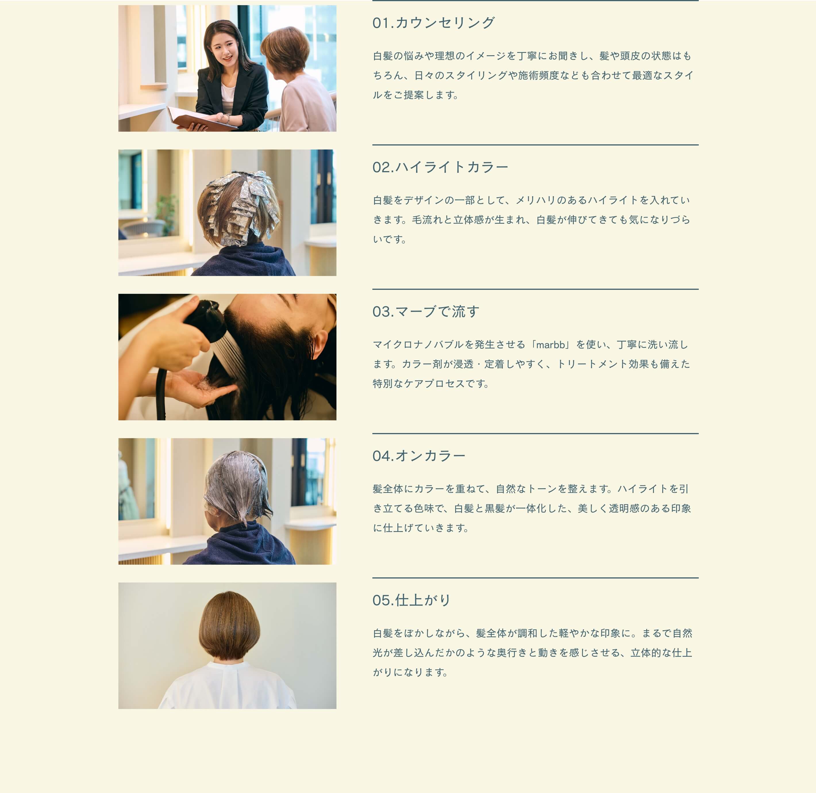 白髪染めを使わずに刺激を抑えたカラーリング方法で、髪質をキープしながら自由にカラーを楽しめます。