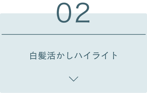 白髪をデザインの一部として、メリハリのあるハイライトを入れていきます。毛流れと立体感が生まれ、白髪が伸びてきても気になりづらいです。