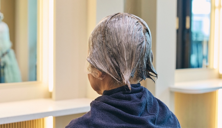 髪全体にカラーを重ねて、自然なトーンを整えます。ハイライトを引き立てる色味で、白髪と黒髪が一体化した、美しく透明感のある印象に仕上げていきます。