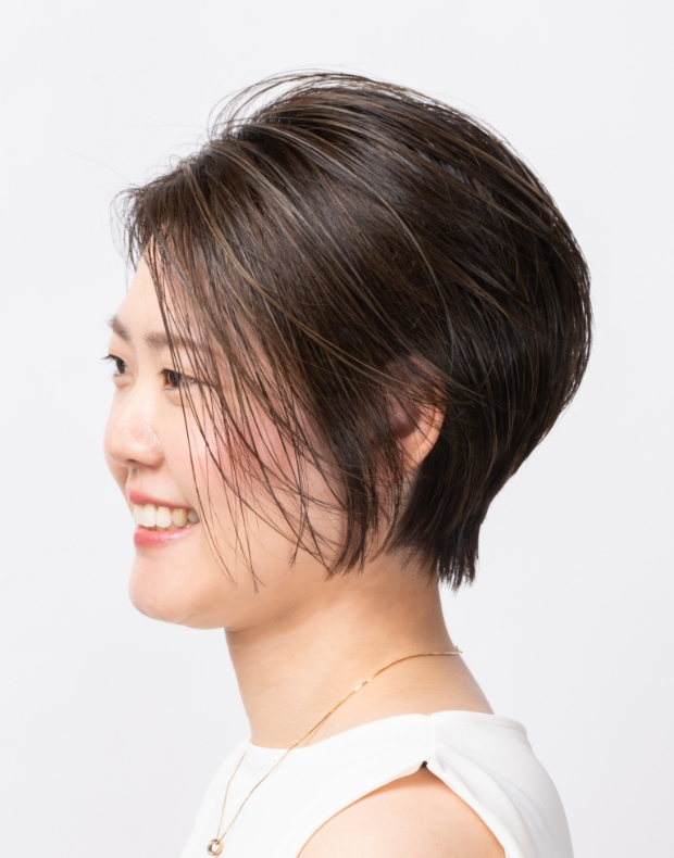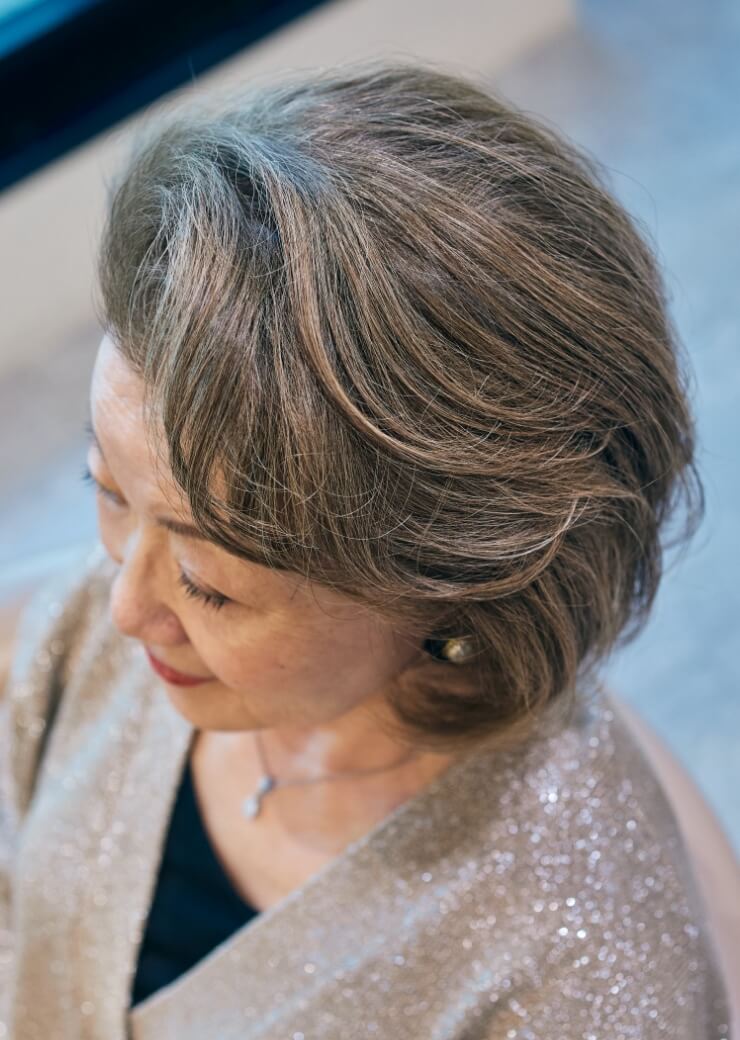 細かなハイライトを白髪に加え、髪全体のデザインに自然に馴染ませます。白髪と黒髪が一体化したような柔らかなグラデーションを作り出すことで、生え際も目立ちにくくなります。