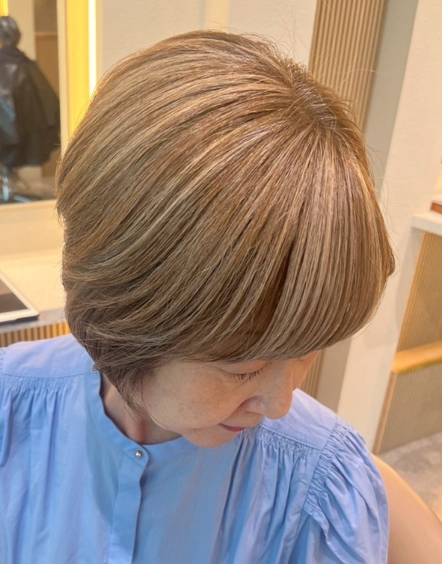 白髪をぼかしながら、髪全体が調和した軽やかな印象に。まるで自然光が差し込んだかのような奥行きと動きを感じさせる、立体的な仕上がりになります。