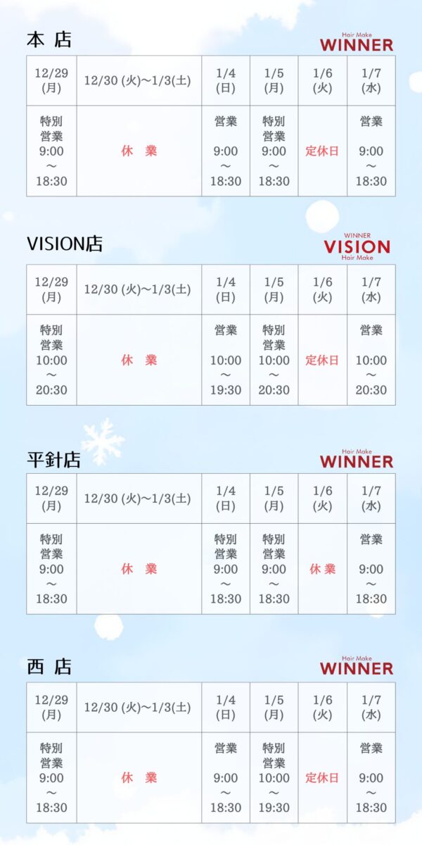 ( WINNER NEWS ) 2025.12.18 NEWS 年末年始の営業について ウインナー全店舗は、年末12月29日(月)まで営業、12月30日(火)から1月3日(土)までお休みさせていただきます。 年始は4日(日)より営業いたします。